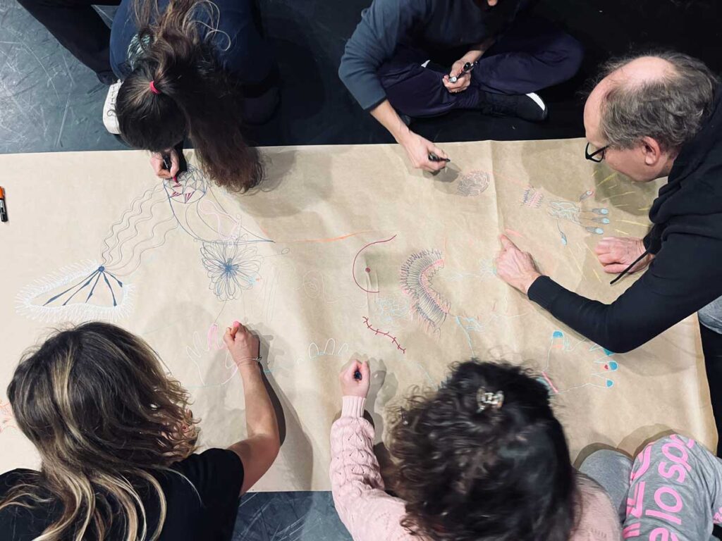 « Carte sensible », atelier né du spectacle L’Aorte, mêlant dessin, lexique et cartographie imaginaire pour interroger notre rapport à l’amour — ou à d’autres thématiques, selon les contextes (notamment mené au Théâtre Onyx et en PREAC).