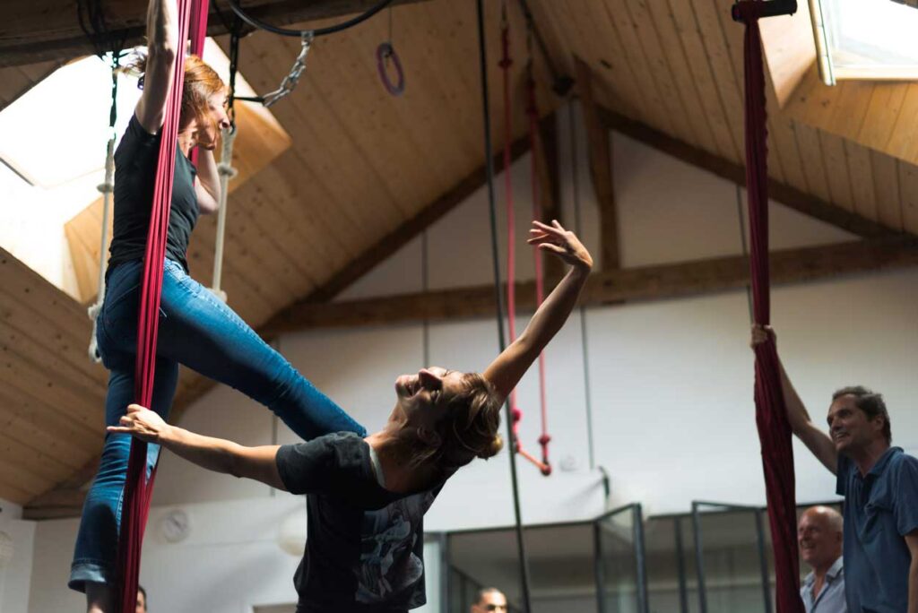 « Créativité en aérien », un stage pour tenter de déconstruire les codes esthétiques du trapèze — les gribouiller, les tordre — et explorer le jeu, l’improvisation et d’autres chemins d’expression.